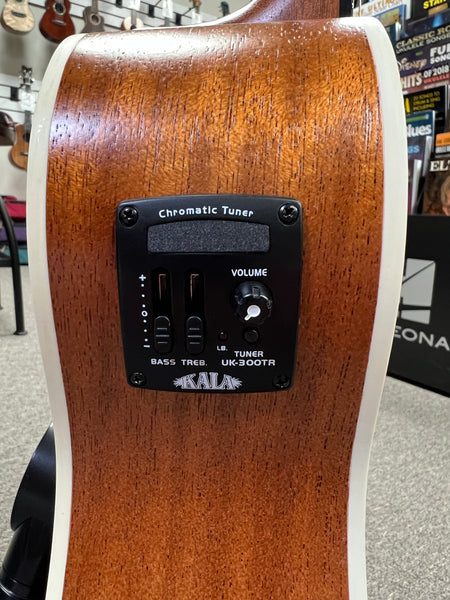 The KA-BE model includes a built-in Kala UK-300TR preamp system with an EQ and tuner, allowing for easy amplification and tonal adjustments during performances. This feature makes it suitable for both practice and live settings.