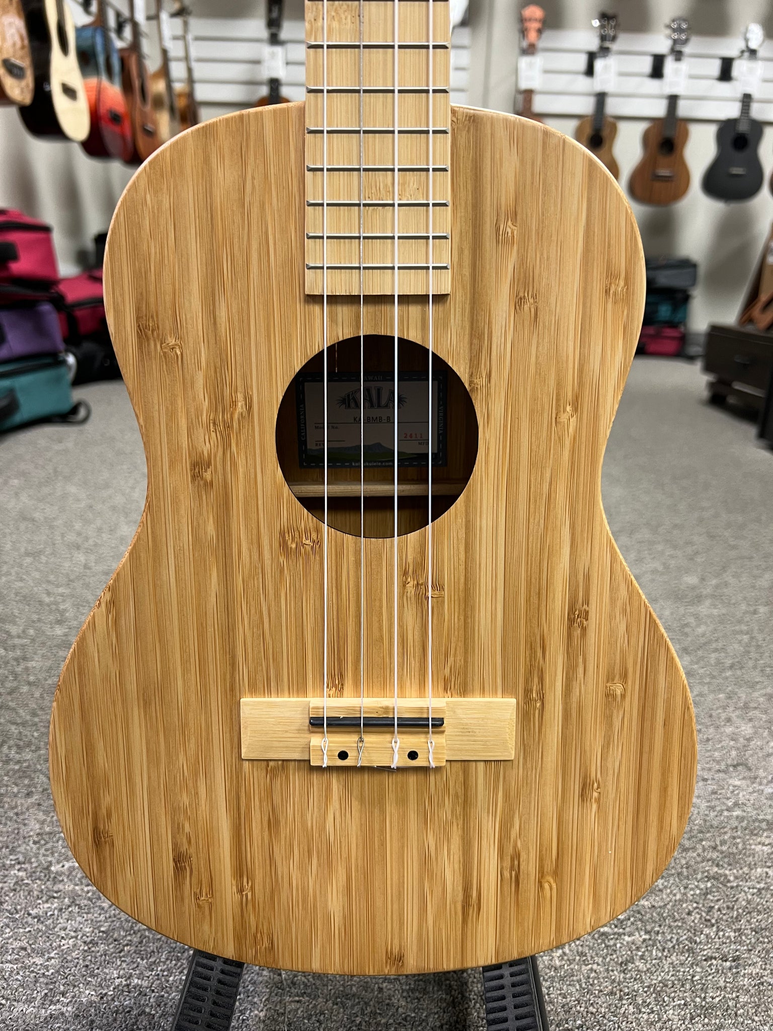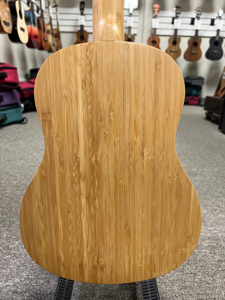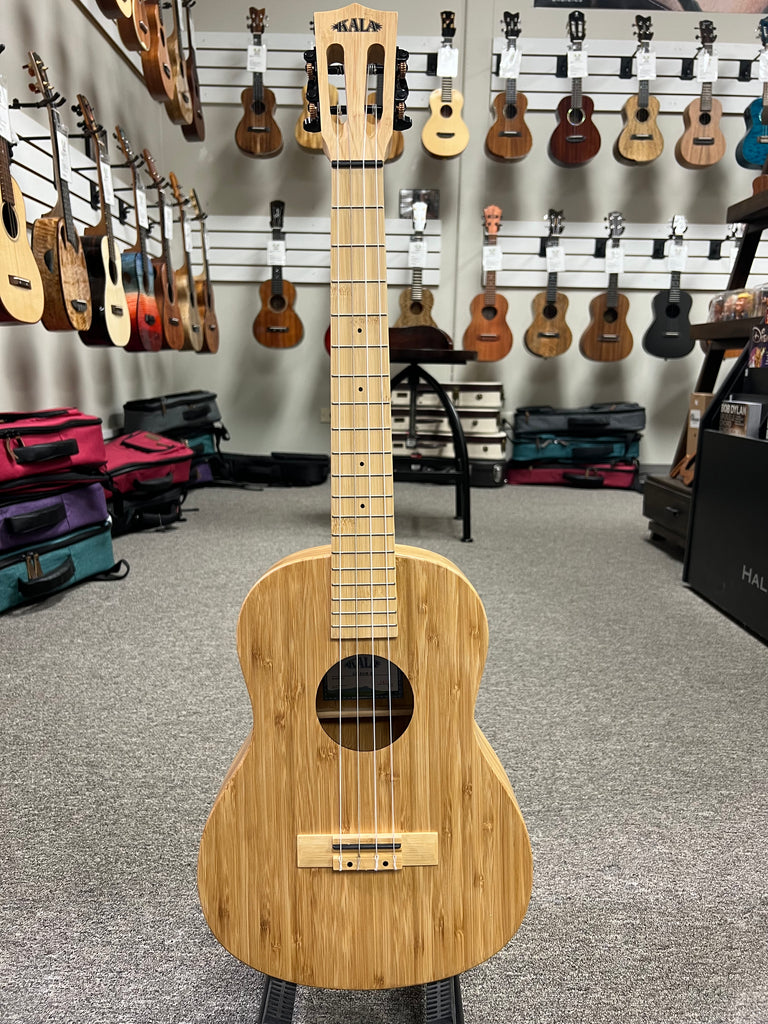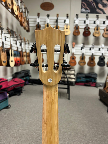 The Kala KA-BMB-B Bamboo Baritone Ukulele is a striking fusion of sustainability and superior sound. Crafted entirely from solid bamboo—top, back, sides, neck, and fingerboard—this instrument stands out for its eco-friendly materials and resonant tone. Bamboo's straight grain and layered structure not only provide a natural, earthy aesthetic but also contribute to a bright, clear sound with excellent volume, projection, and sustain.