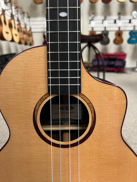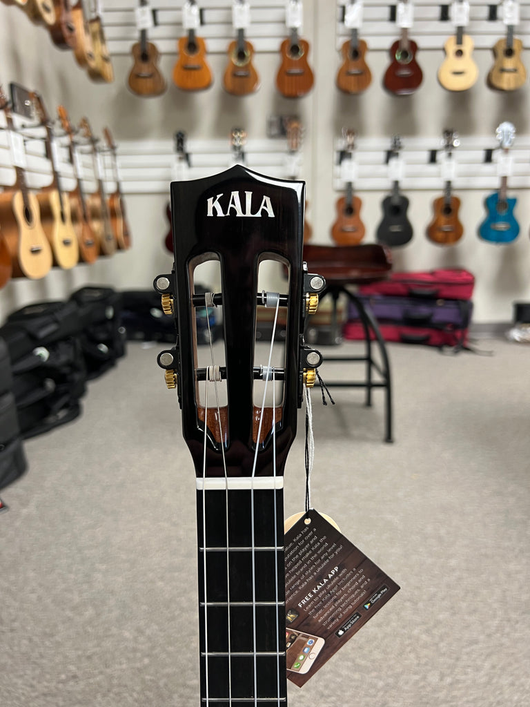 The Kala KA-CT-SSRW-BG Baritone Ukulele is a premium instrument from Kala's Contour Series, designed to offer both exceptional sound and visual appeal. This baritone ukulele features a solid spruce top paired with solid rosewood back and sides, delivering a bright, articulate tone with deep resonance. The mahogany neck and ebony fingerboard contribute to a smooth playing experience, while the purpleheart binding adds a touch of elegance. The slotted headstock and Venetian cutaway enhance its aesthetic and functionality, providing easy access to higher frets. A two-tone eclipse wood rosette further accentuates its unique design. This model comes with a padded gig bag for protection and portability.