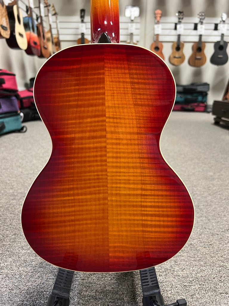The Kala KA-FMCB-T Tenor Ukulele is a stunning instrument that combines striking aesthetics with exceptional playability. Its flame maple construction—featuring a laminated flame maple top, back, and sides—offers a clear, transparent tone with excellent projection and note separation. The warm cherry burst gloss finish, complemented by cream body binding and an abalone soundhole rosette, adds a touch of elegance to its visual appeal.