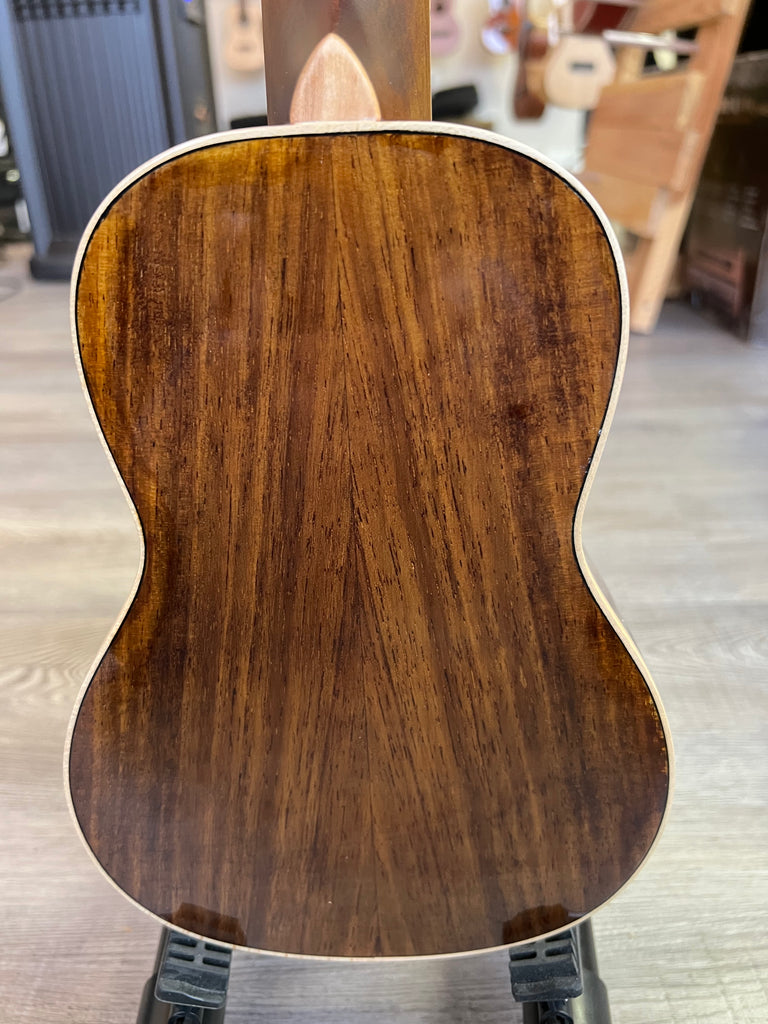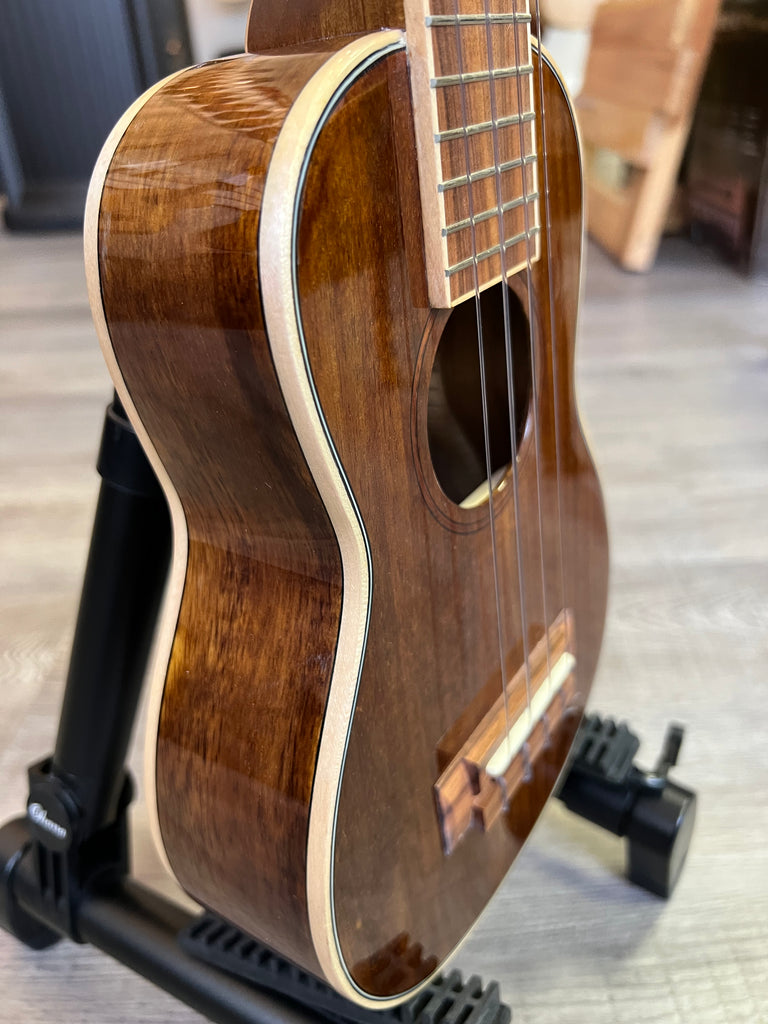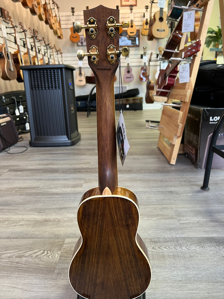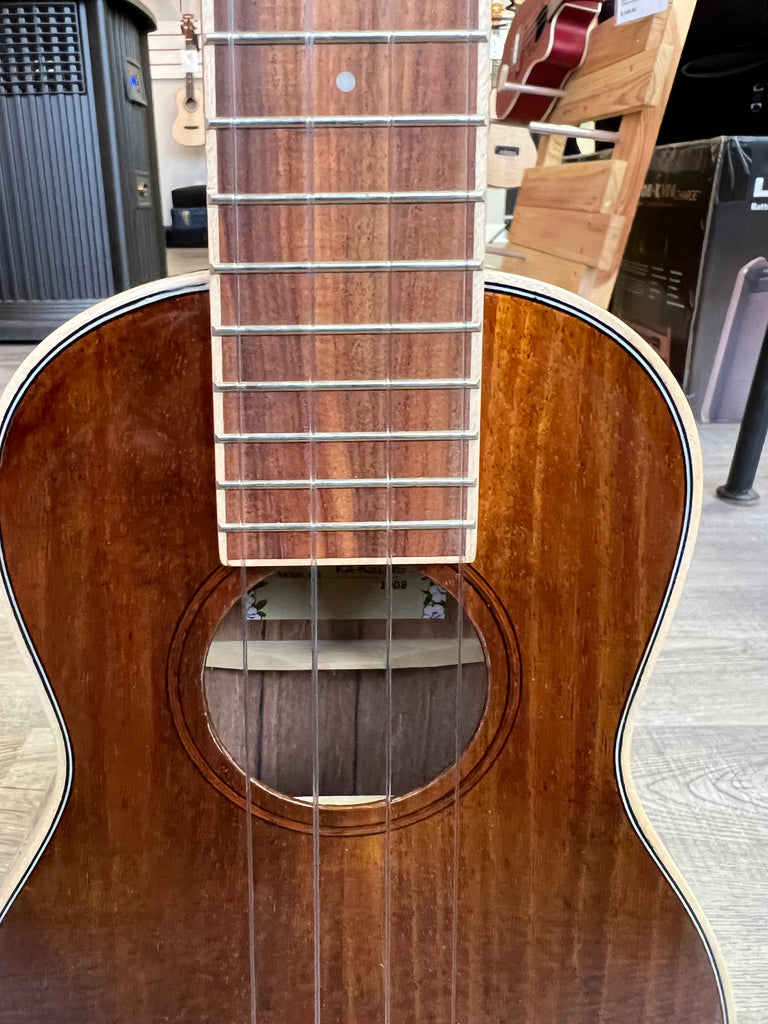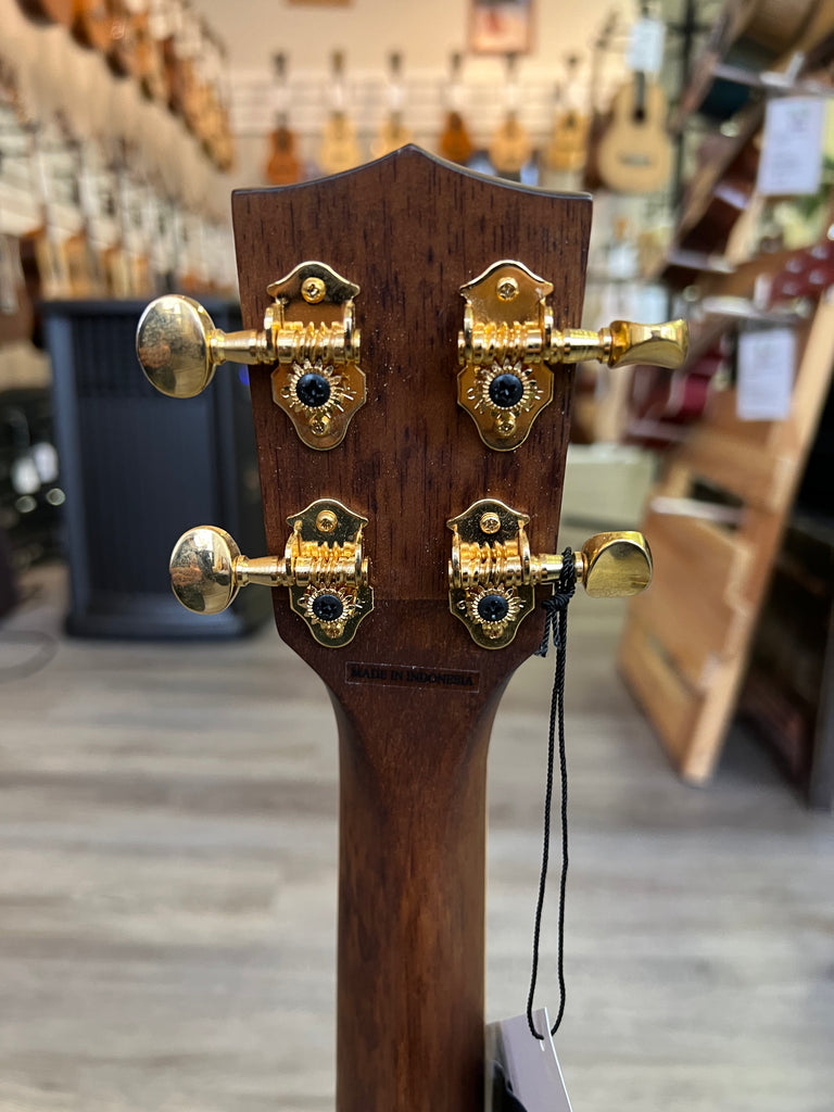 Finished in a glossy sheen, the ukulele features elegant maple binding and black purfling, highlighting its refined aesthetic. The mahogany neck is complemented by a rosewood fingerboard, ensuring smooth playability. Gold open-gear tuners provide precise tuning adjustments, and the instrument is strung with D’Addario Titanium strings, known for their bright and clear sound.