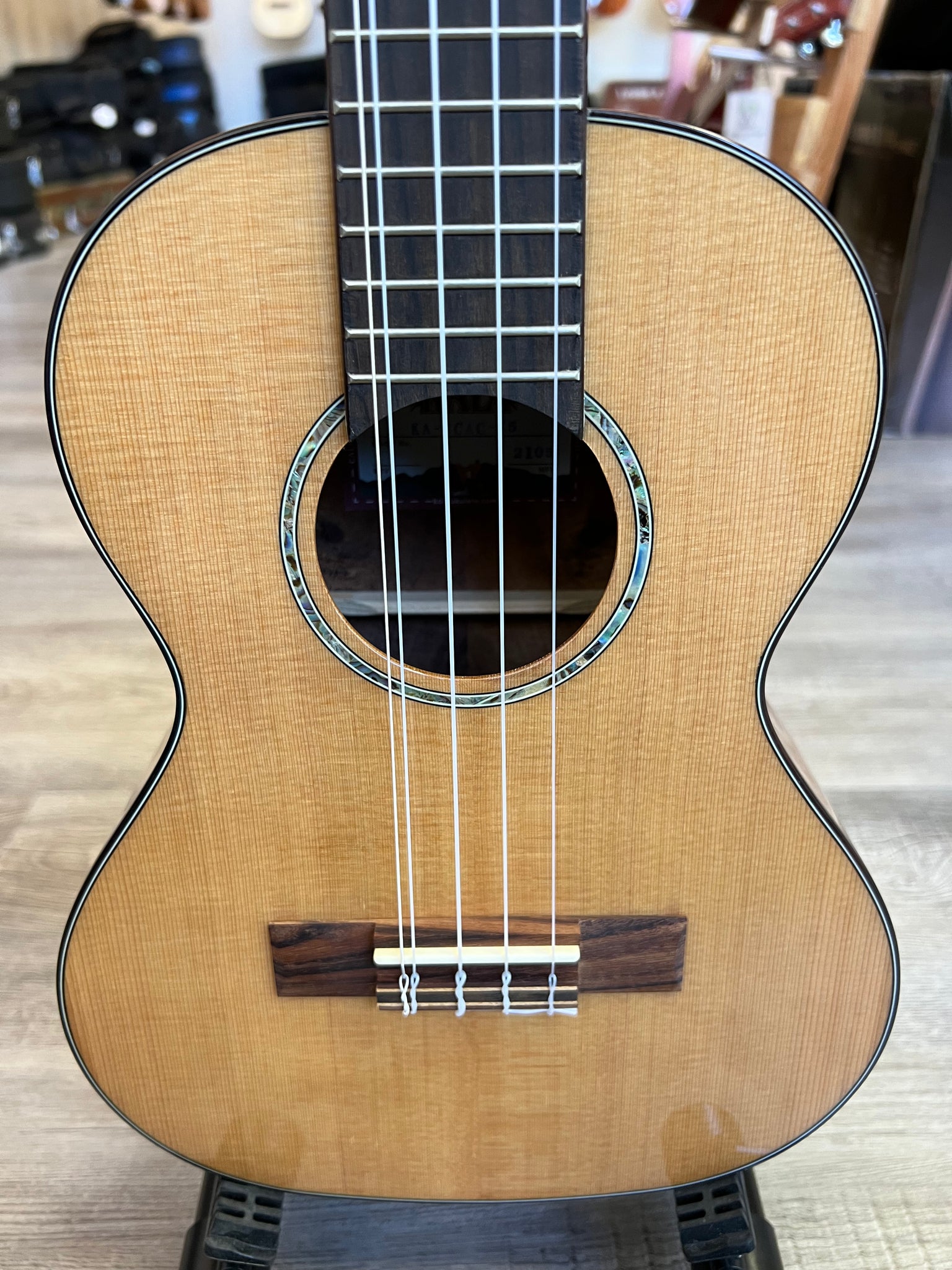 This ukulele features a solid cedar top paired with laminated acacia back and sides, delivering a warm, resonant tone that's perfectly suited for fingerstyle playing or strumming. The gloss finish enhances its visual appeal, while the rosewood binding adds a touch of sophistication. An abalone rosette further elevates its aesthetic charm.