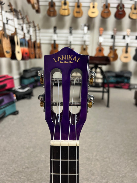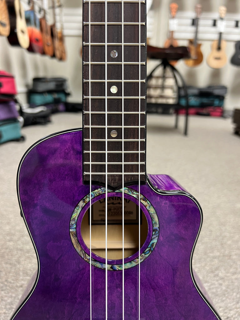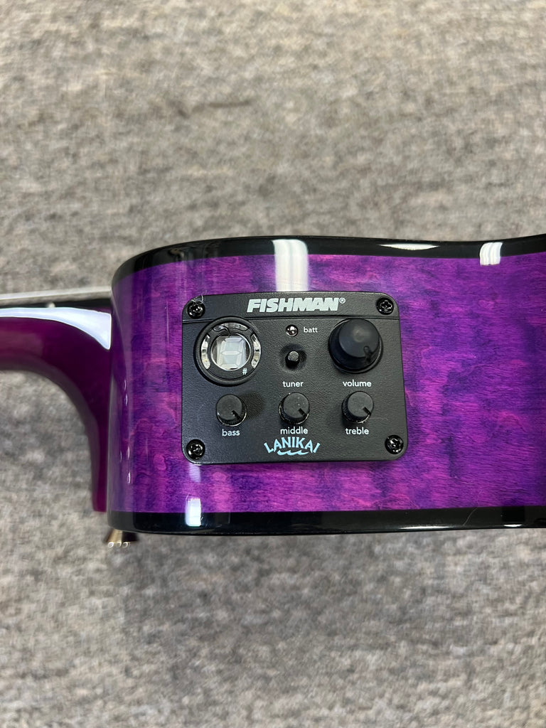 This is one AMAZING looking ukulele. The trans purple finish over the quilted maple with all of the abalone is spectacular and the slotted headstock adds a nice touch of class as well. It plays like butter and comes with a Fishman EQ and built-in tuner so you're ready to plug in and always be in tune. Comes with a Lanikai Deluxe Case. Aloha !!