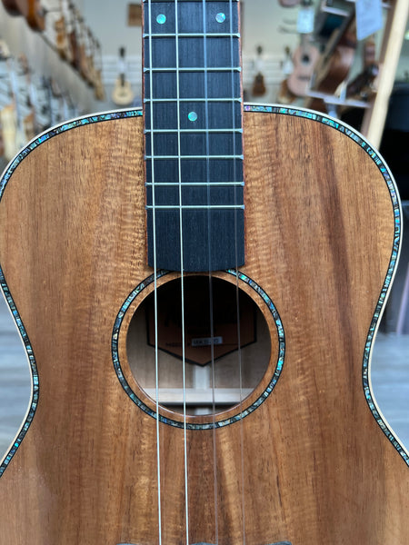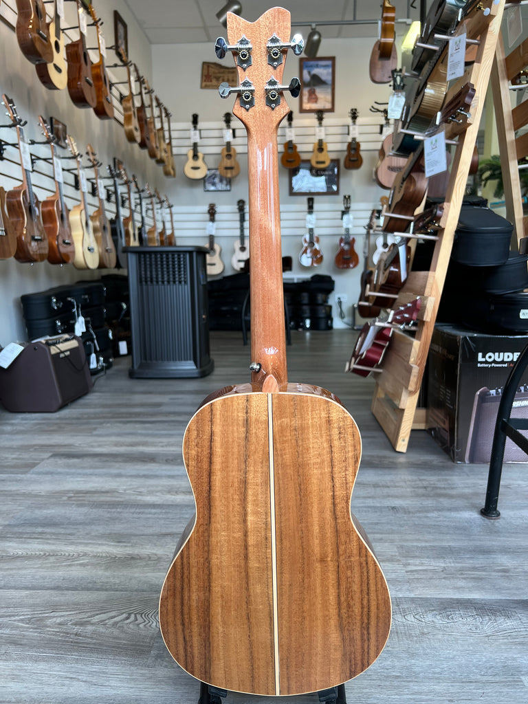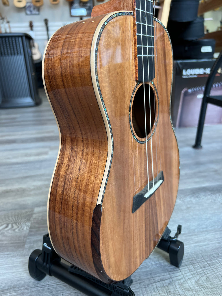 Makaio Fluorocarbon Low D Strings: These strings are chosen for their durability and tonal quality, complementing the ukulele's natural resonance.