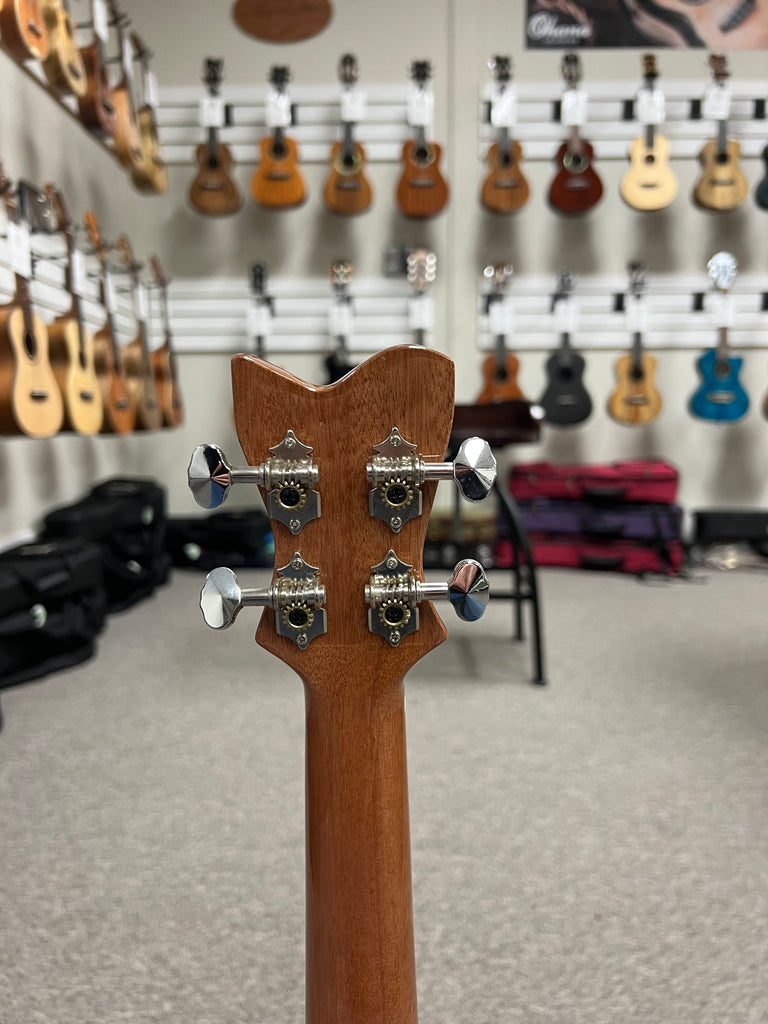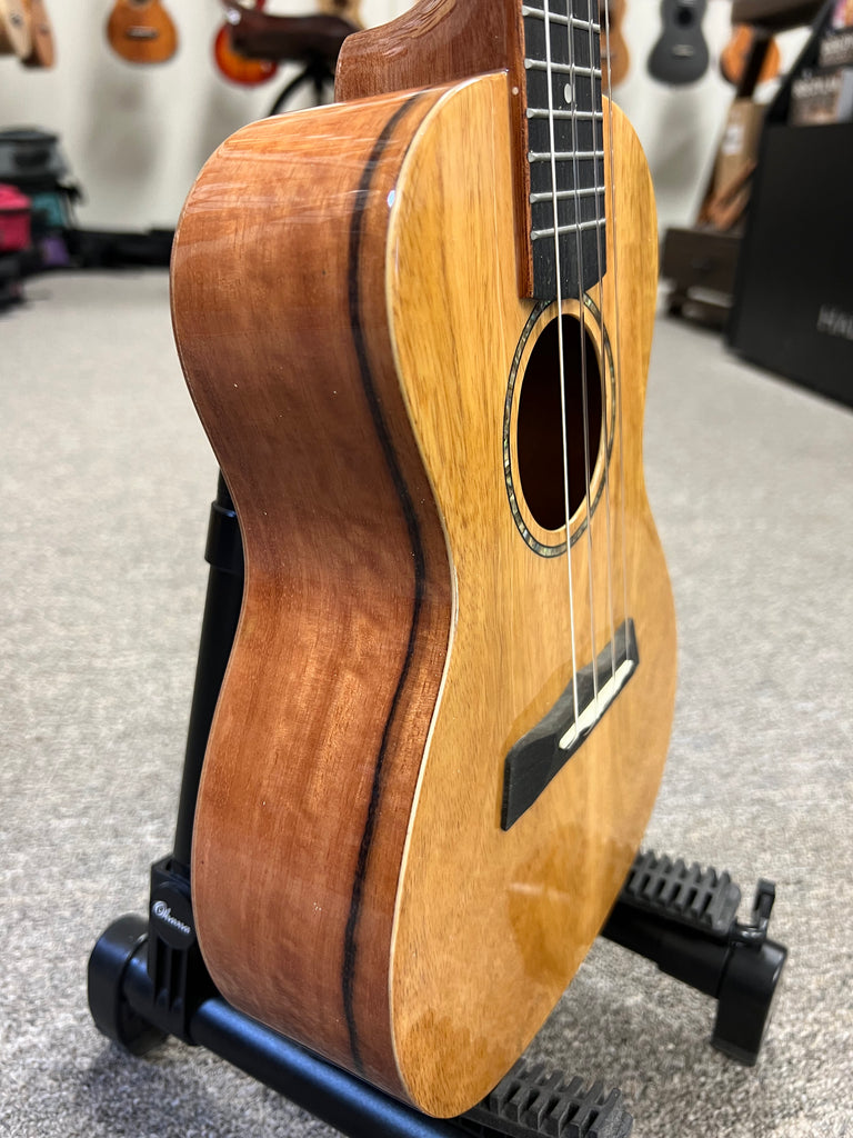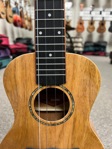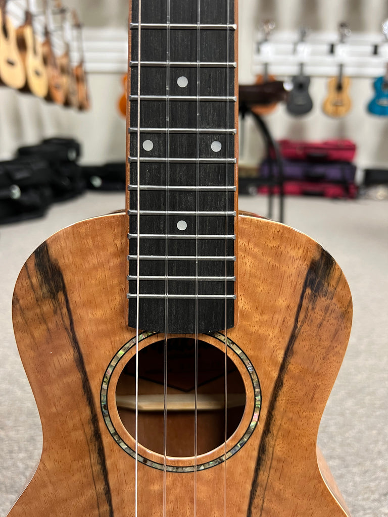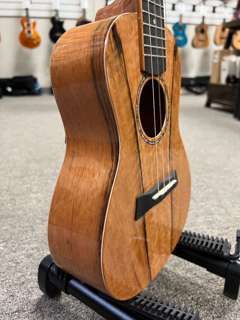 The ukulele's body is constructed from spalted mango, a wood known for its unique grain patterns and warm, golden hues. This distinctive appearance not only makes each instrument one-of-a-kind but also contributes to its beautiful tonal properties.