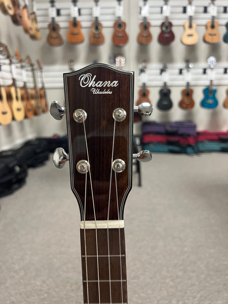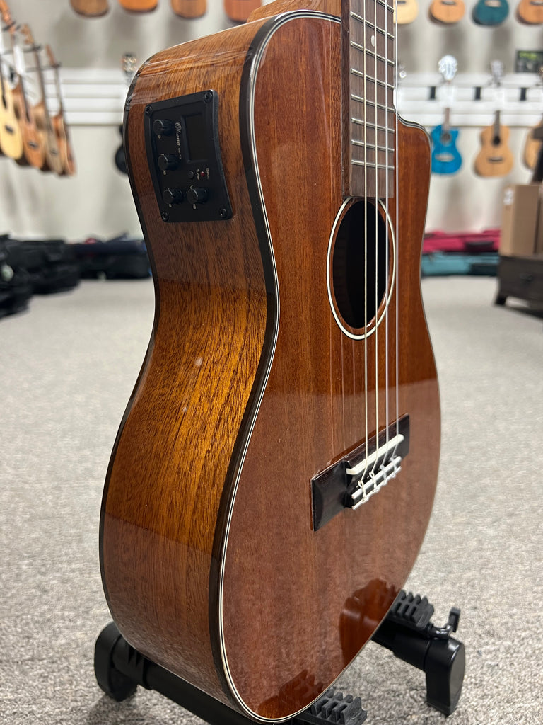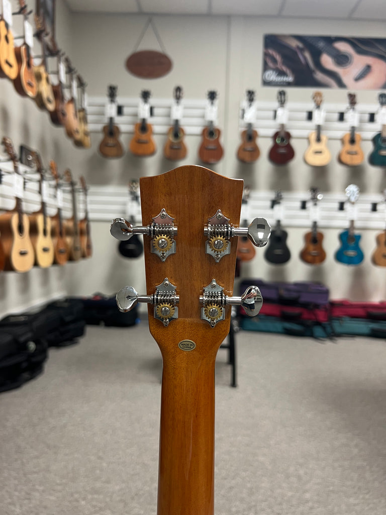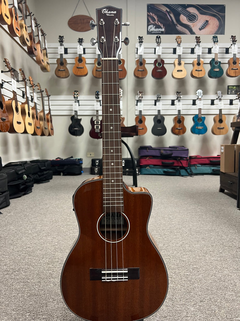 This classy looking baritone from Ohana features an all solid mahogany body with ovankal binding. The headstock is thin and reminiscent of high-end Kanile'a ukes. The tone is big, warm, and sweet and the action is perfect making it easy to play for hours. It also comes equipped with a built-in pickup with EQ and tuner so you're ready for the stage or studio!