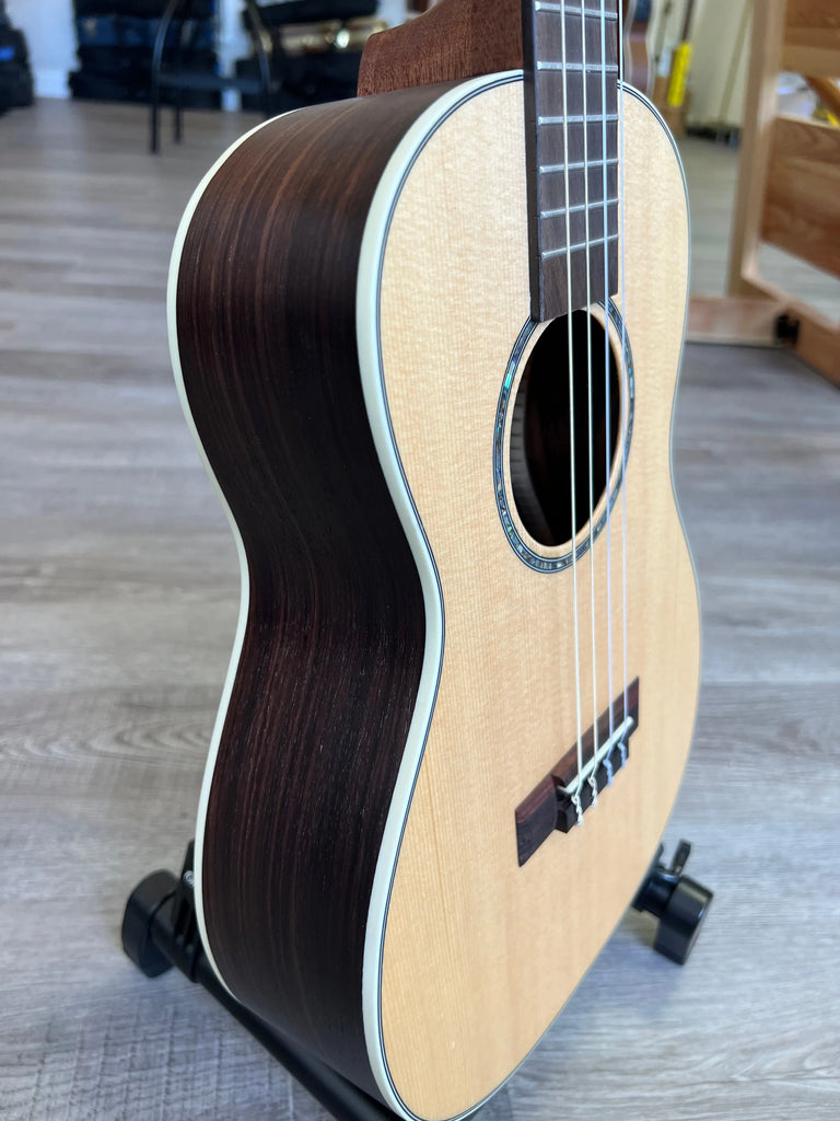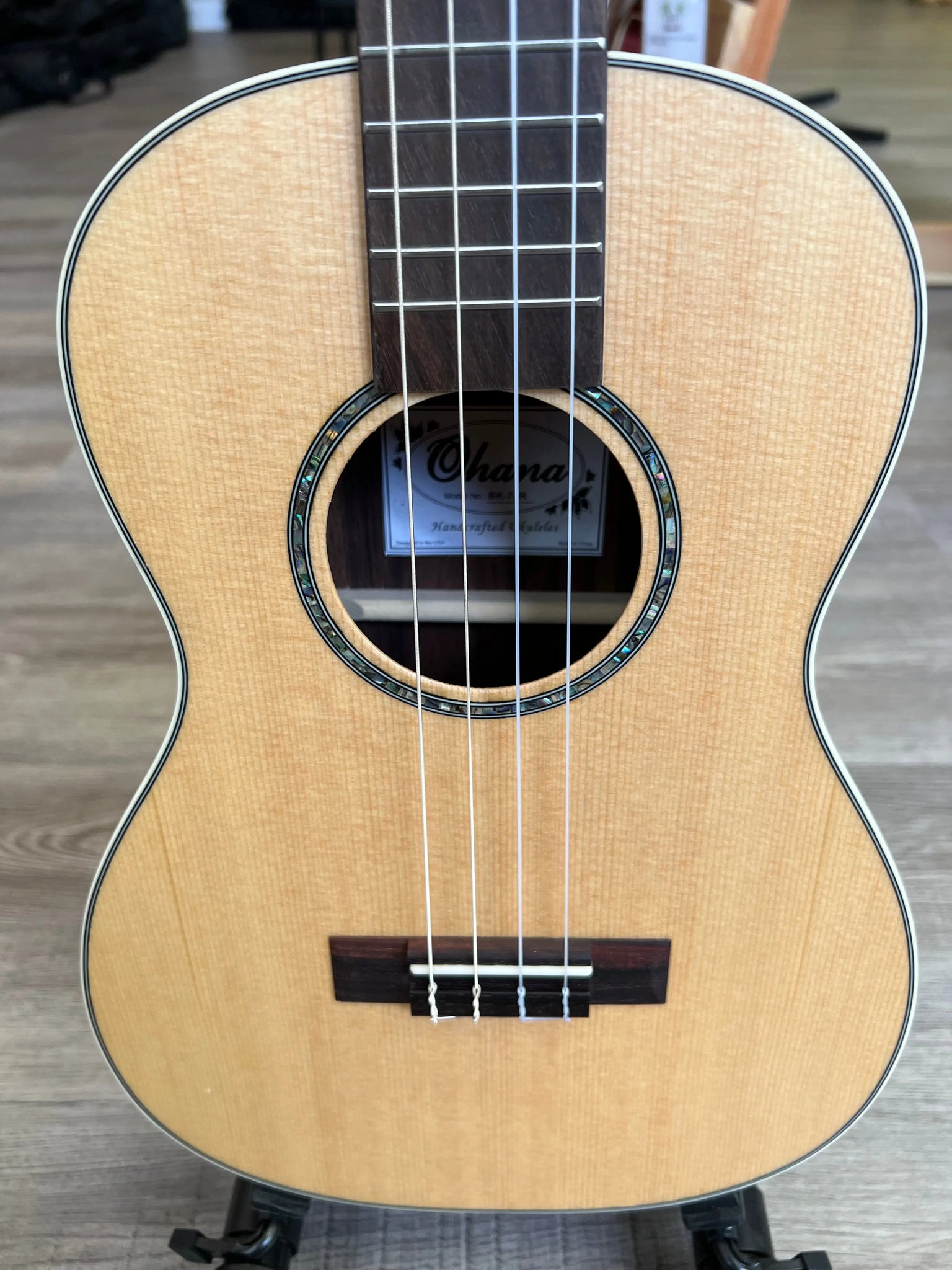 Nice solid top baritone ukulele from Ohana. Featuring a solid spruce top with gorgeous rosewood back and sides. Its got a nice abalone soundhole inlay to go along with the classy looking slotted headstock. It has a satin finish for maximum tone and like all Ohana's, it plays great! Aloha !!