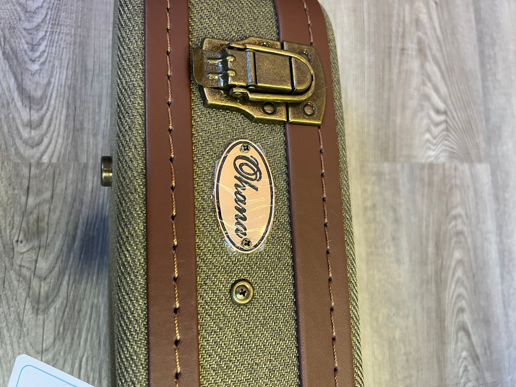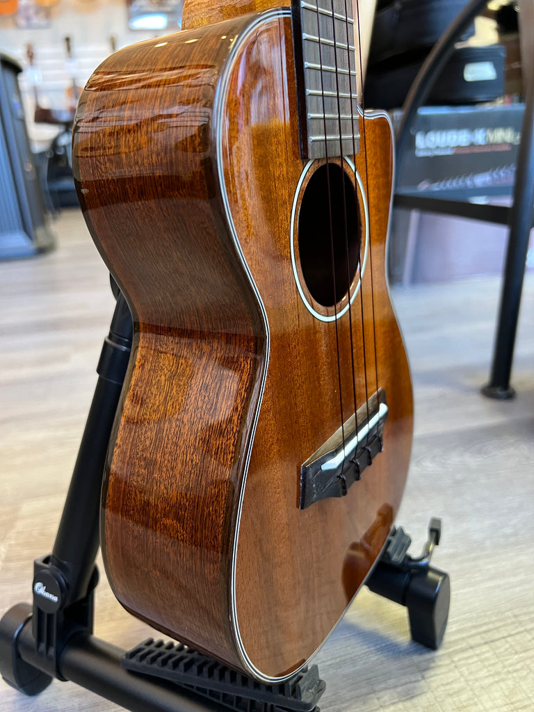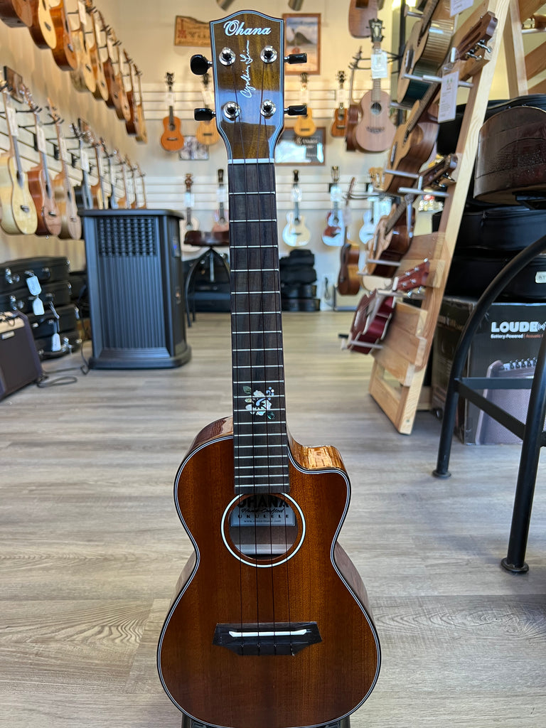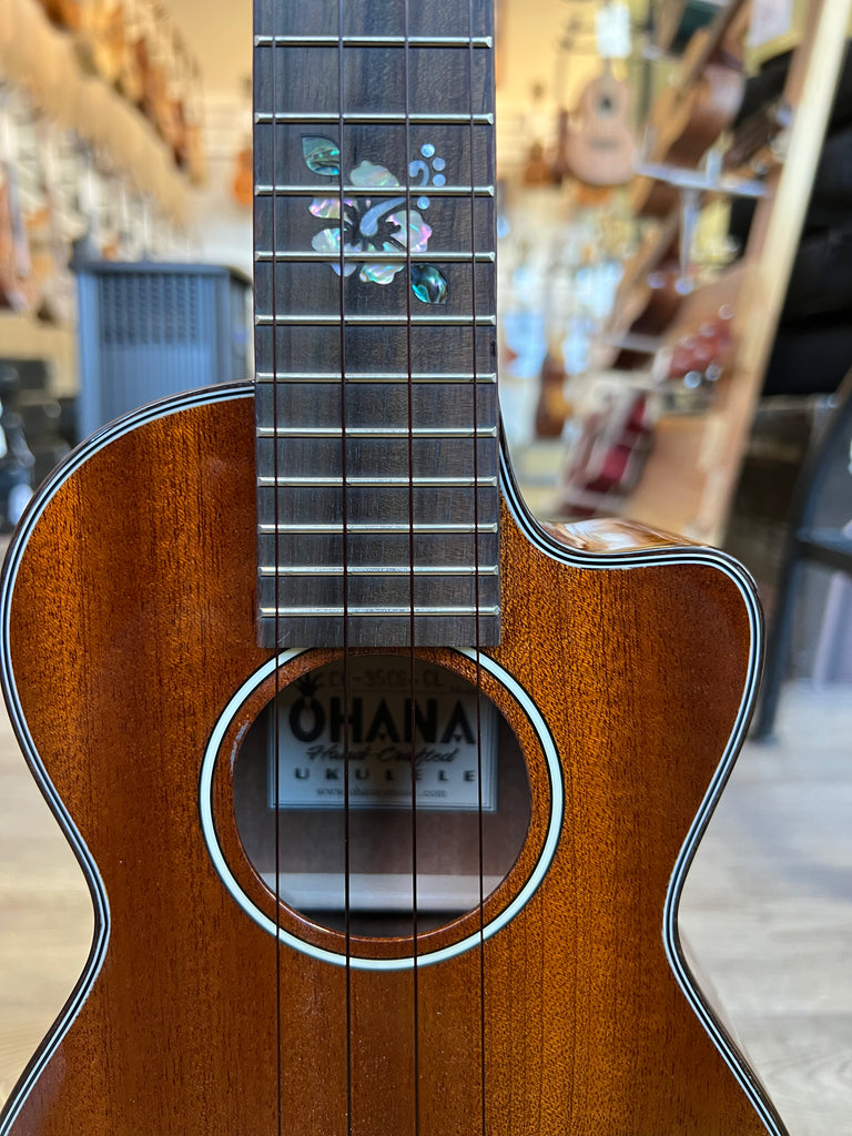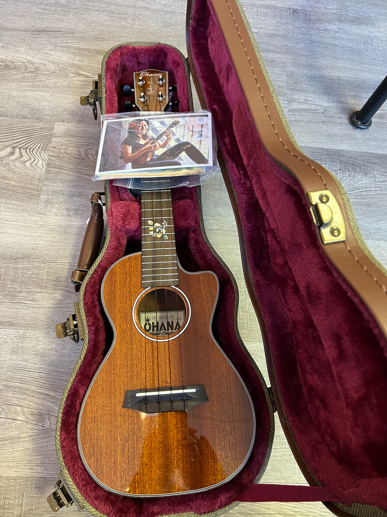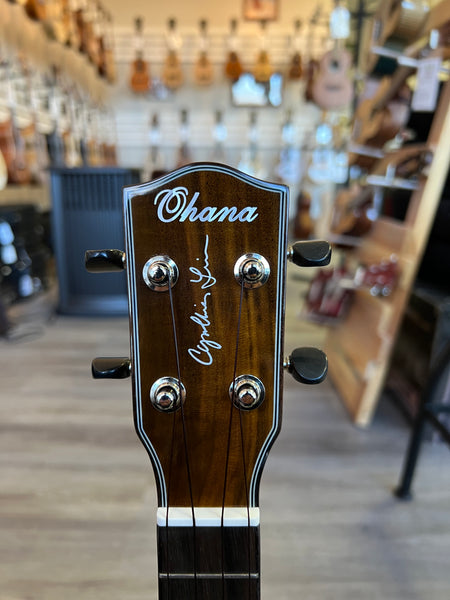 The Cynthia Lin solid wood signature model CK35-GC-CL is a gorgeous little concert ukulele from Ohana. Made from solid mahogany which gives it a nice big warm tone. It also has the Cynthia Lin signature inlay on the fretboard and her actual signature on the headstock. Like all Ohana's, the action is very comfortable and inviting to play for hours. Great looking solid wood uke comes with a deluxe hardshell case and a packet of goodies from Cynthia. Aloha !!