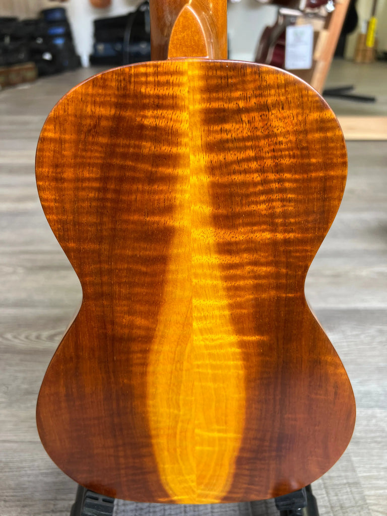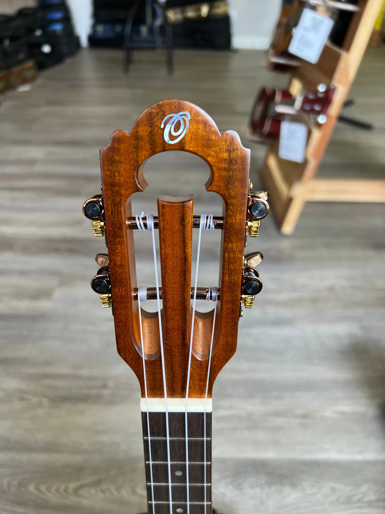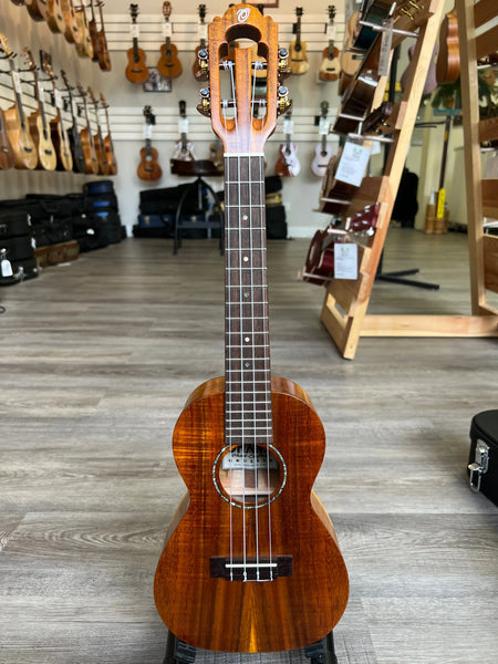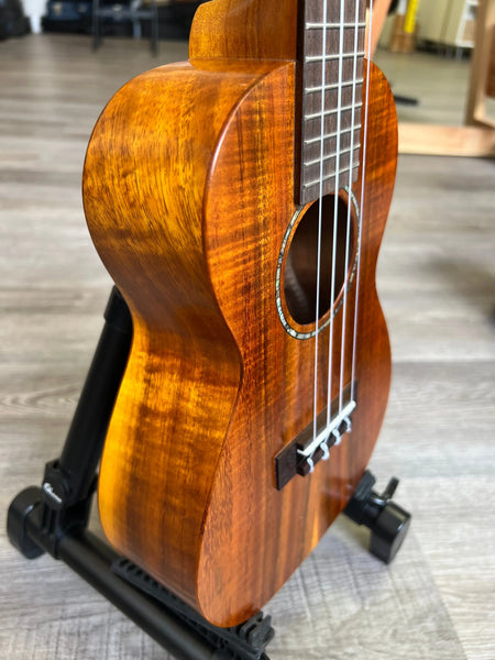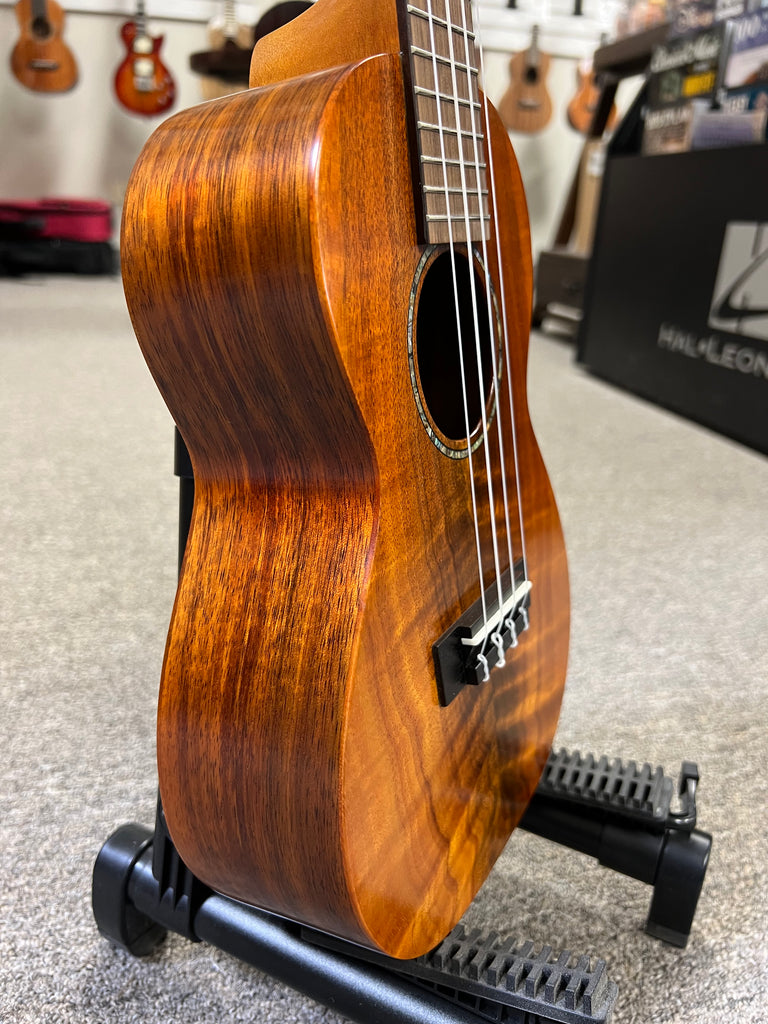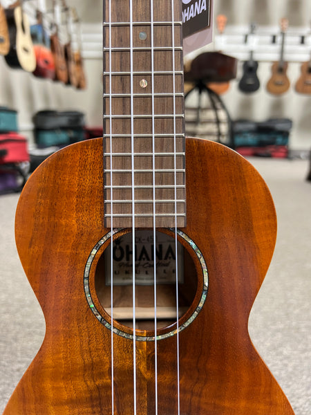 Really sharp looking solid wood concert ukulele from Ohana. This beauty features a solid koa body with a satin finish and slotted headstock. The pattern in the wood is very visually striking and the abalone inlays add a nice touch of class. Aloha to that!