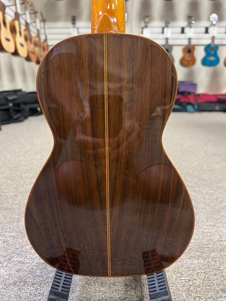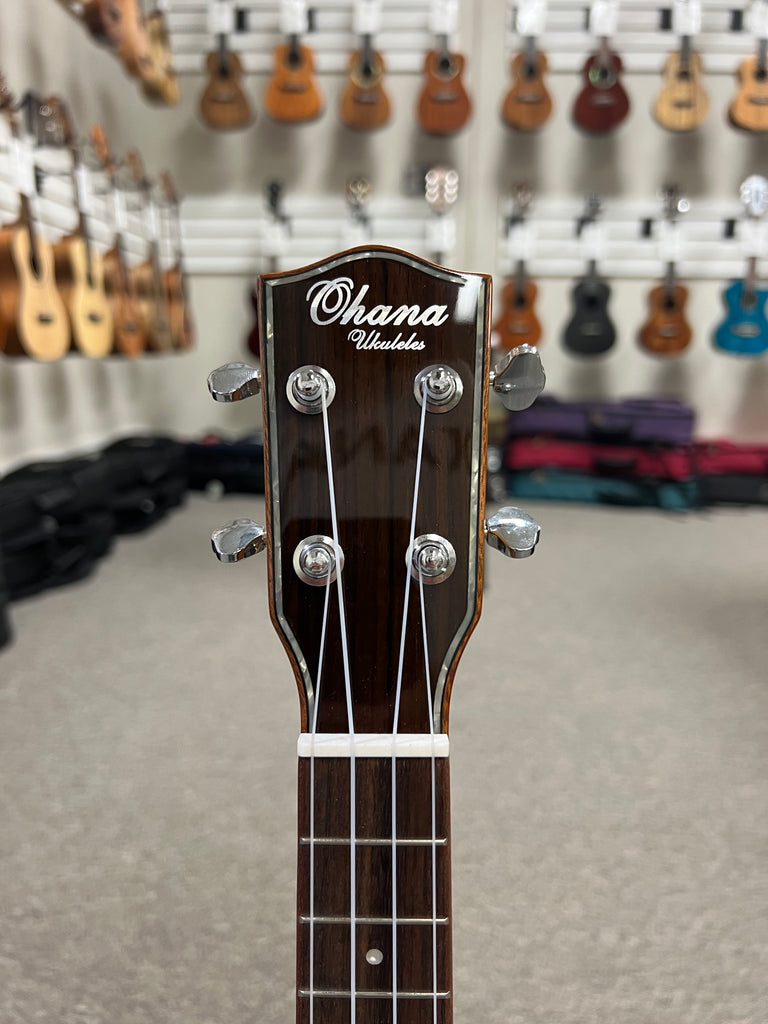 This Ohana concert is one great sounding uke! All solid wood construction consists of a beautiful cedar top with rosewood back and sides. Its rich in sustain with a great mid range. The abalone soundhole rosette is super classy looking and the super high gloss finish really make this uke shine! Try adding a Low G string for an even fuller sound. Aloha !!