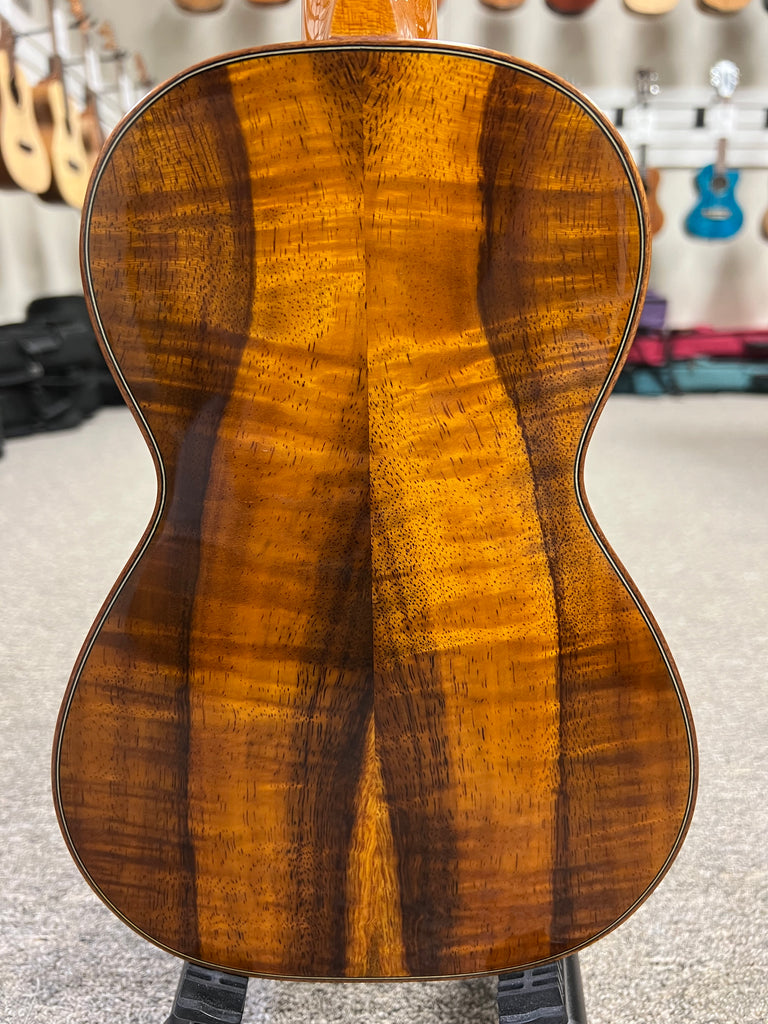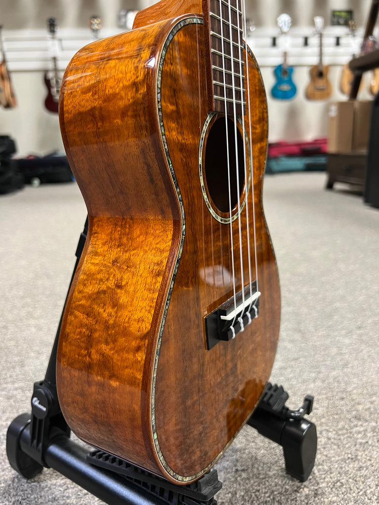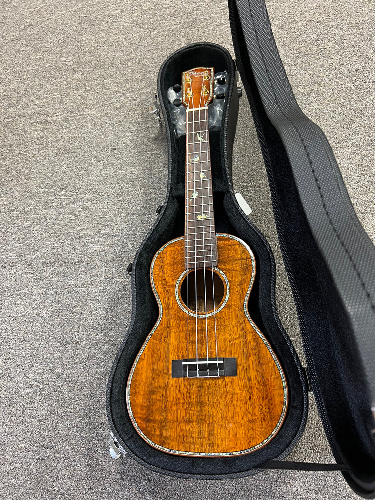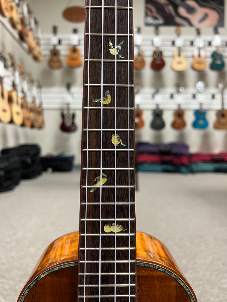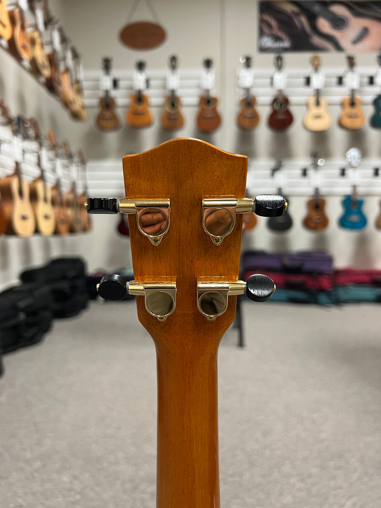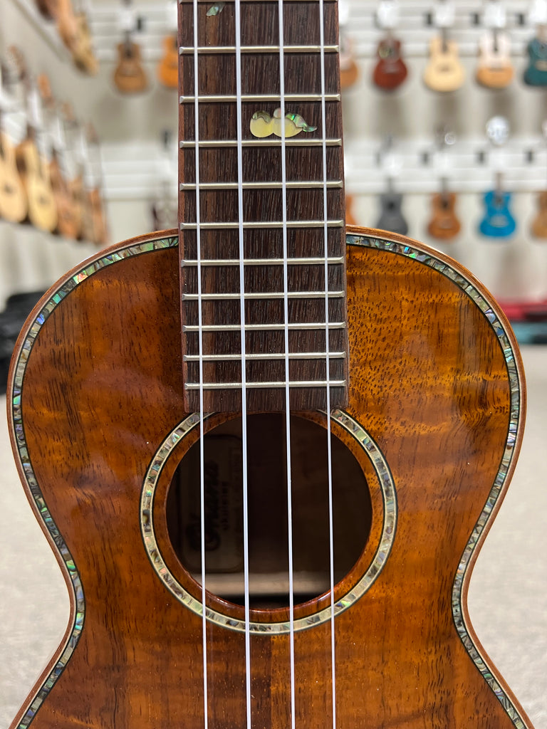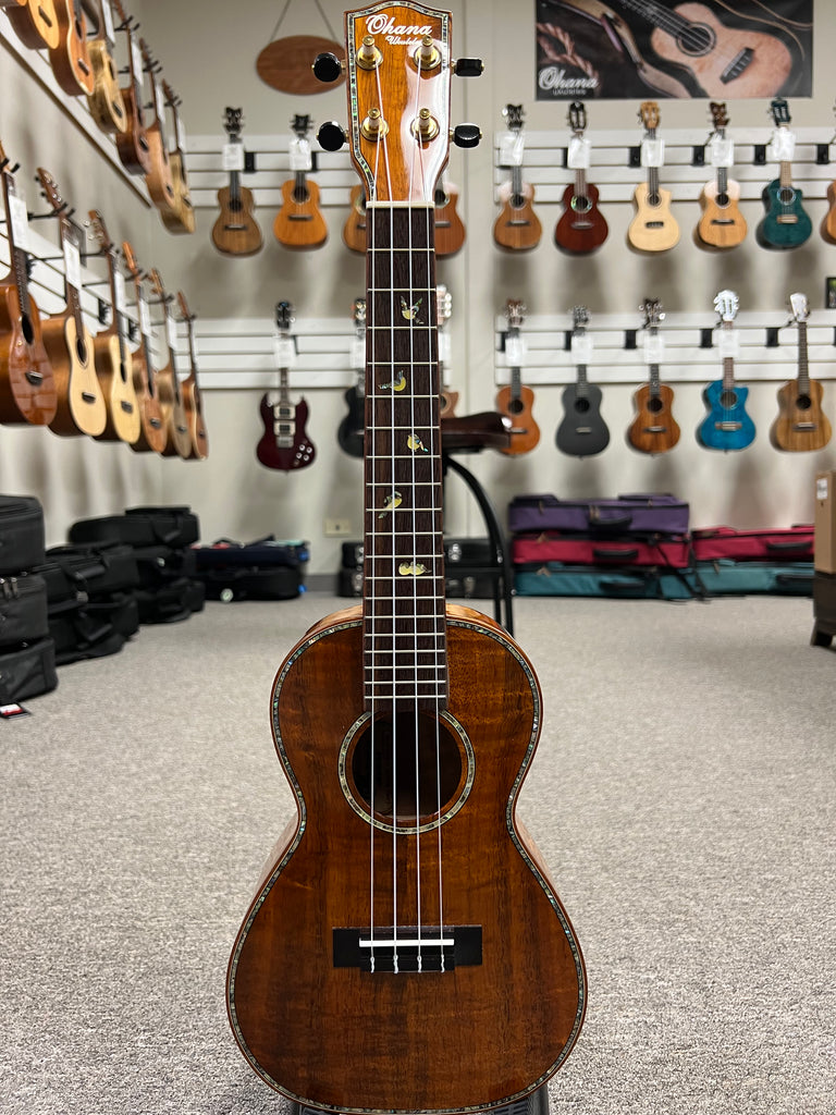 Really sharp looking high end concert ukulele from Ohana. This beauty features an all solid Hawaiian Koa body. Abalone galore on this guy really gives it an ultra classy look. Wood binding around the body and wood buttons on the tuners also add a very cool look. Comes with a nice hardshell case.