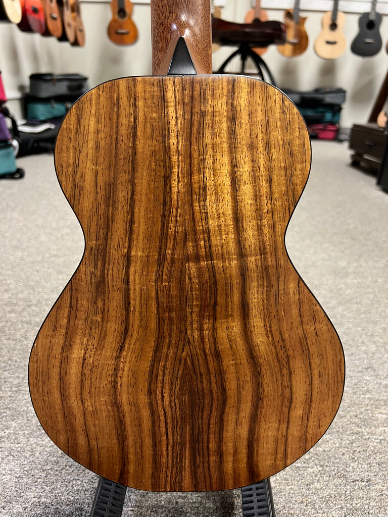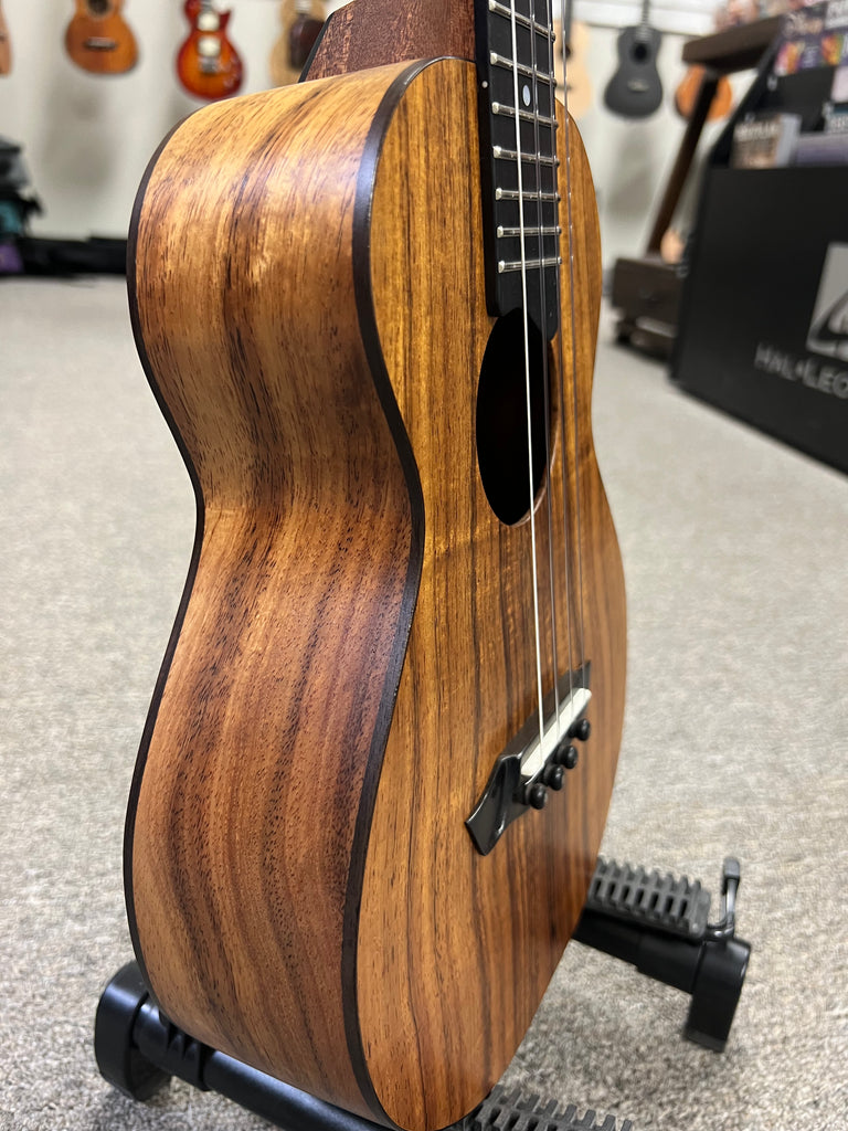 This all solid koa wood beauty comes from Ohana's USA Custom Shop. It has a satin finish that really lets the wood sing and rosewood binding all around the body. It's a simple and elegant USA made Hawaiian Koa tenor with a great sound and feel.