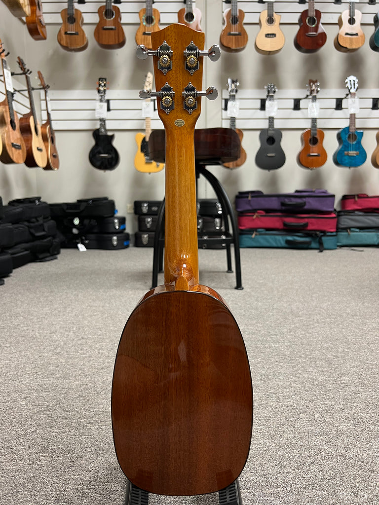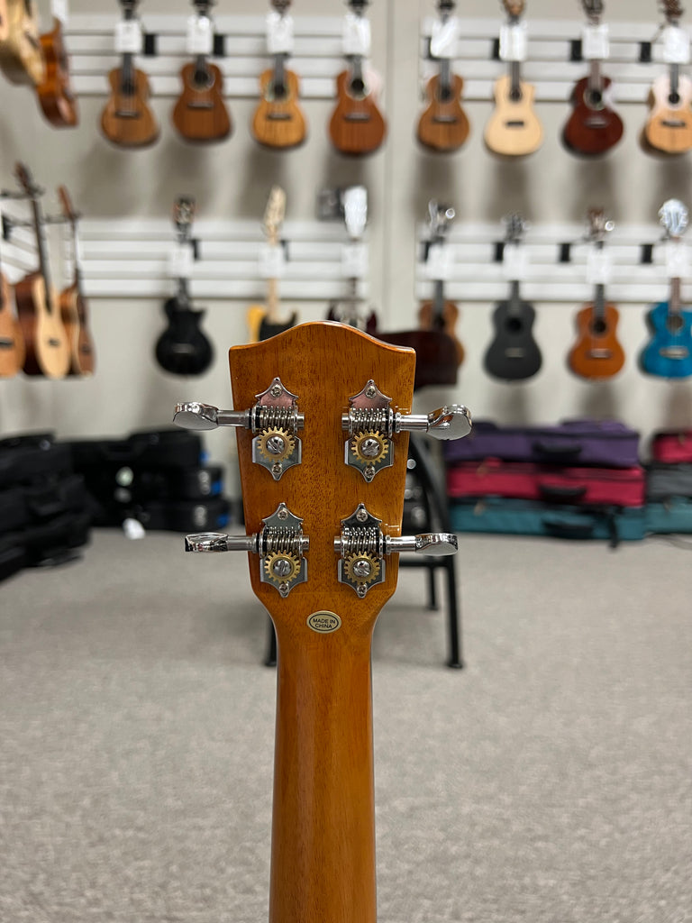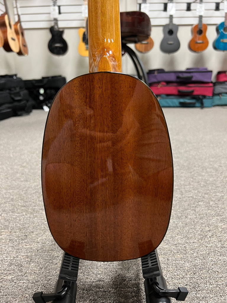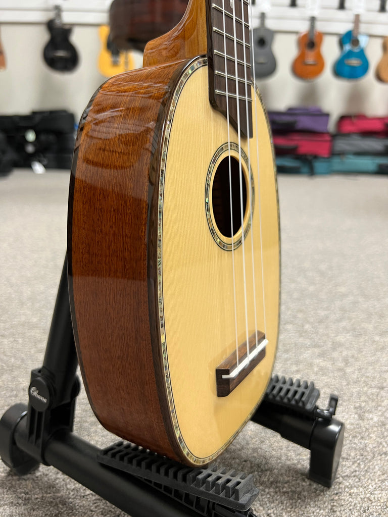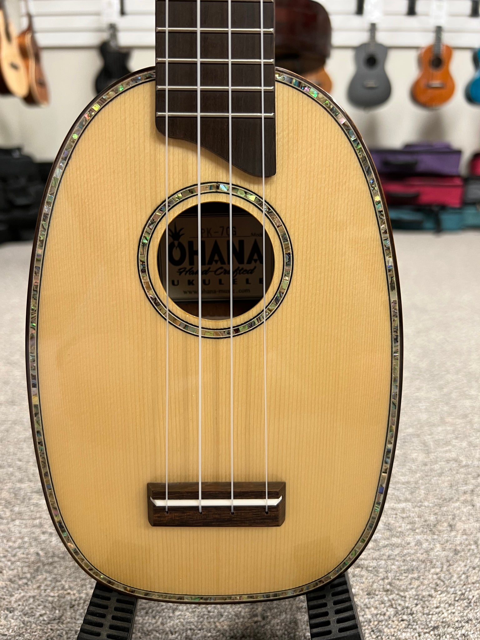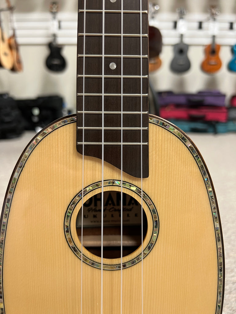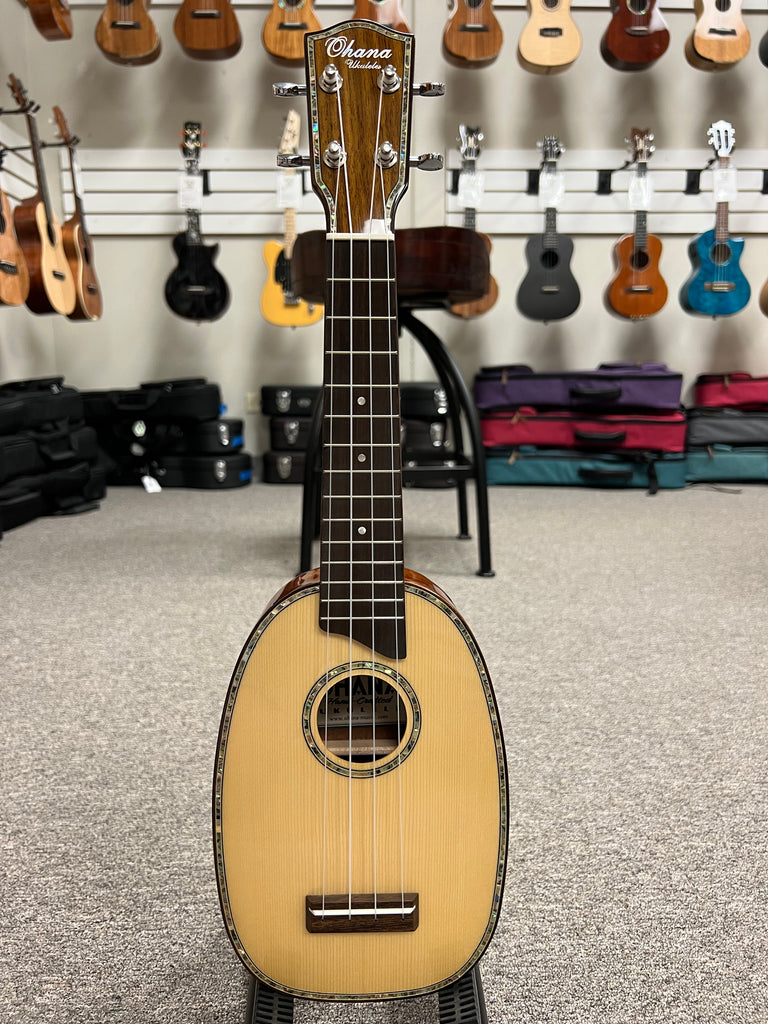 The Ohana PK-70G is a classy little pineapple uke that features a solid spruce top and solid mahogany back and sides. It also has abalone all around to give it an extra touch of class. Aloha !!