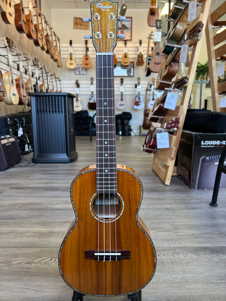 Really sharp looking solid wood tenor ukulele from Ohana. This beauty features a solid koa body with mahogany binding. The pattern in the wood is very visually striking and the abalone inlays are a nice touch of class. Aloha to that!