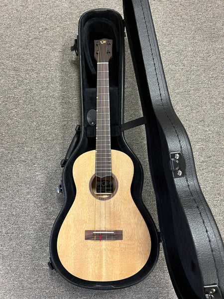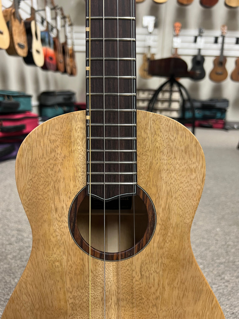 Sound-wise, the solid mango body combined with the instrument’s internal lattice bracing delivers a bold yet balanced voice. It projects a warm, full-bodied tone with good sustain and a smooth low-end — perfect for baritone tuning (commonly D-G-B-E) and ideal for strumming, soft fingerstyle, or soulful solo playing. Many players describe the mango body as having a “tropical” warmth reminiscent of koa but with a bit more bounce and clarity.