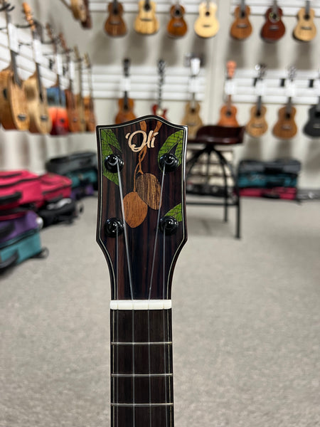 Gorgeous looking and sounding solid Mango concert here from 'Oli Ukulele. An ebony bridge and fingerboard along with a radius fretboard make this uke a joy to play. The side sound port helps project the sound up at you while you play and the headstock is a work of art. This model has a smooth high gloss finish on the body and a satin finish on the neck. 2024 Model.