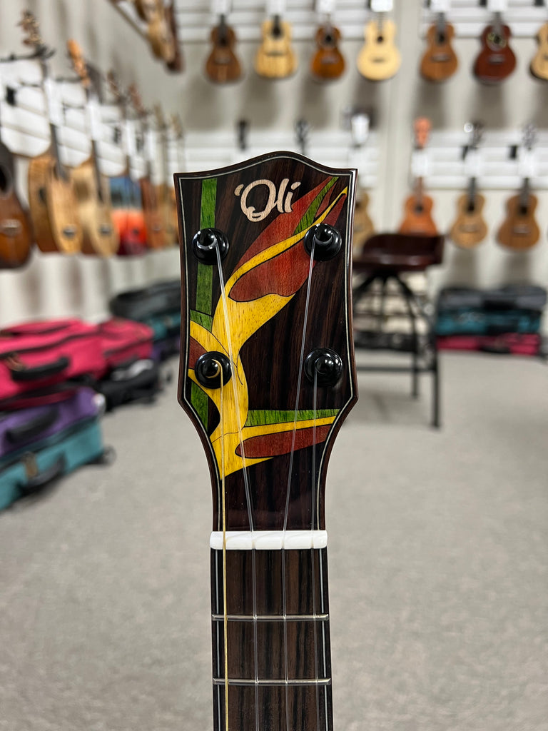 Gorgeous looking and sounding solid wood tenor here from 'Oli Ukulele. This beauty features the tried and true combination of Solid Cedar and Solid Rosewood for a sweet tone. An ebony bridge and fingerboard along with a radius fretboard make this uke a joy to play. A side sound port and a beautiful Hawaiian floral headstock add to the beauty of this great uke. This model has a smooth high gloss finish on the body and a satin finish on the neck. 2024 Model.