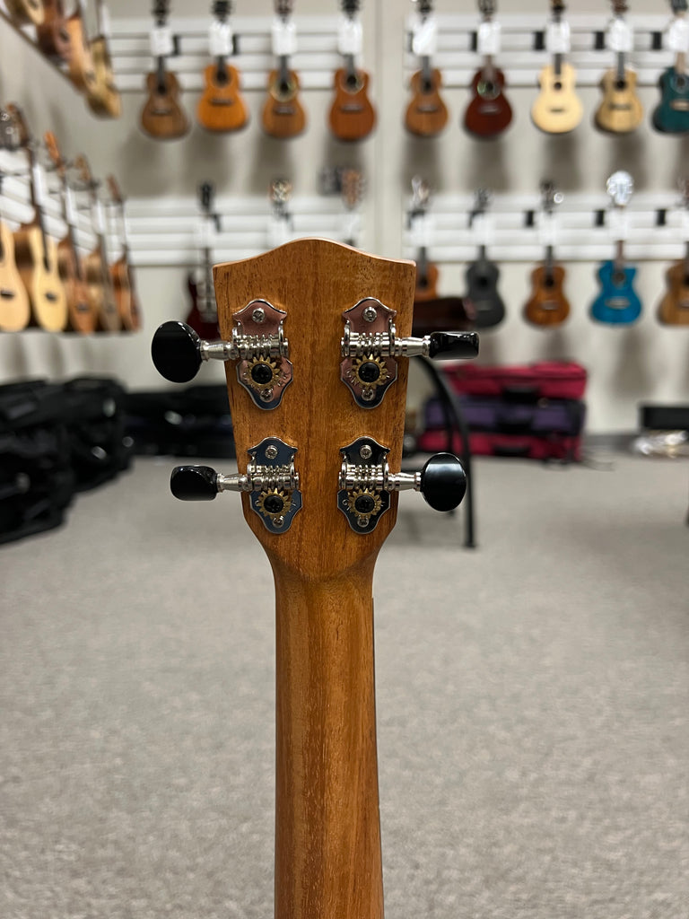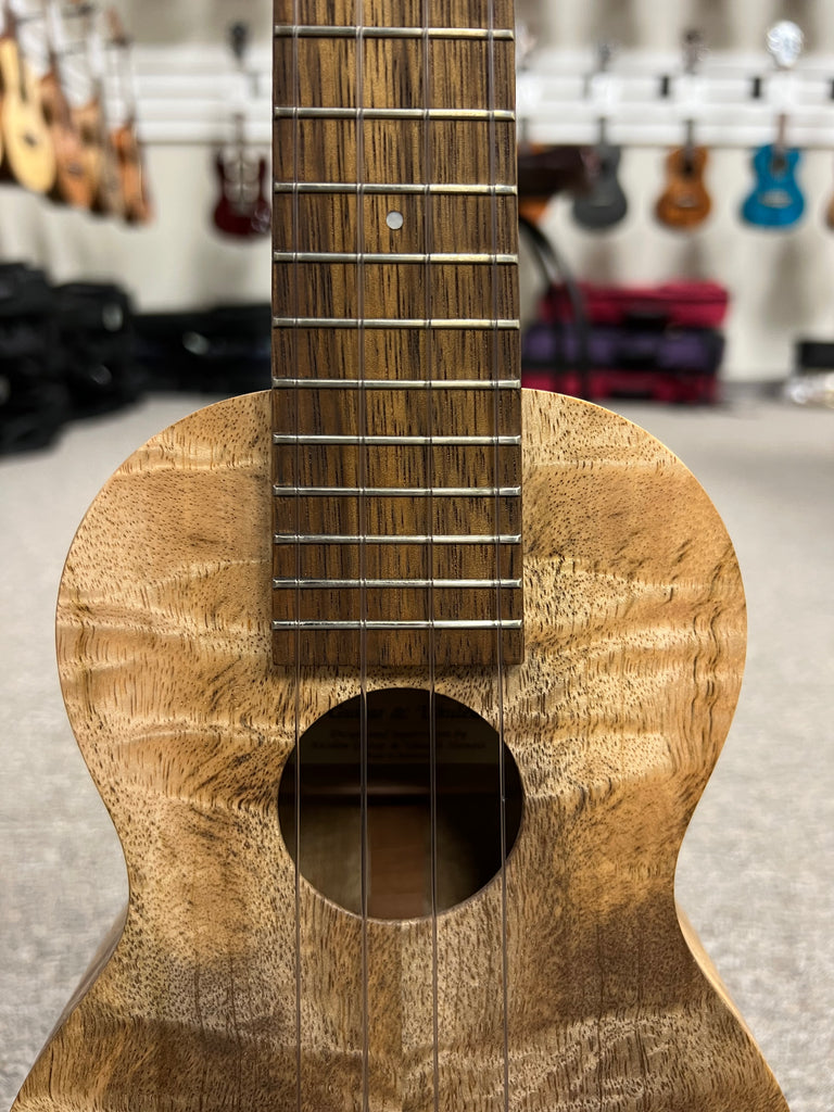 Great little soprano from Pono Ukuleles. This one features an all solid mango body to go along with the merbau bridge and fingerboard. The tone is very warm and classic Hawaiian ukulele sounding. The action is also great making it easy to play for hours. Aloha to that !!