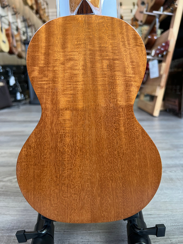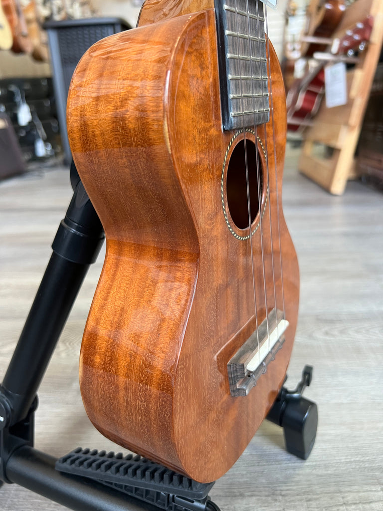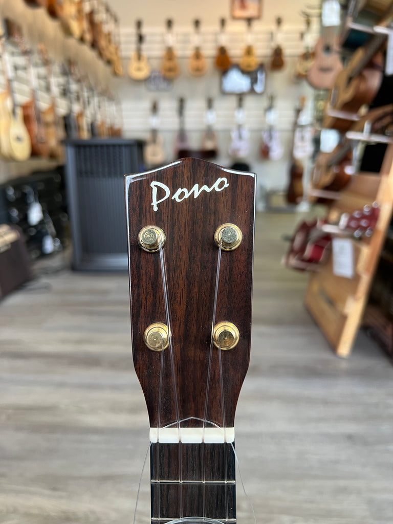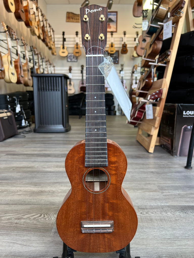 Amazing sounding little Pono Soprano ukulele. This model features an all-solid mahogany body to go along with the ebony bridge and fingerboard. The gloss finish really shines in the light. You will not be disappointed with this little beauty as it produces a very lively sound that projects very well. Aloha !!