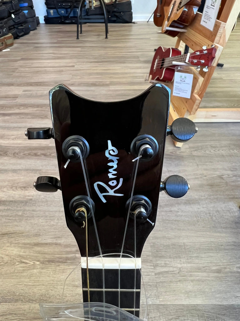 This Romero Creations concert ukulele is not your average concert sized uke! It's larger body and all solid wood construction produces an amazing tone. Like all Romero Creations ukes it's also a joy to play as the action is perfect all the way up the neck. You'll get a nice big sound from this solid wood uke. All Romero's come with a Low G set up and a nice Romero Creations carrying case. Aloha !