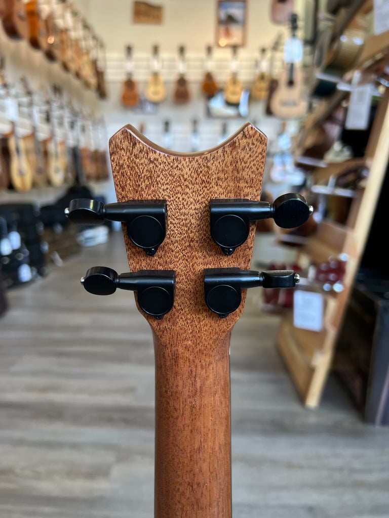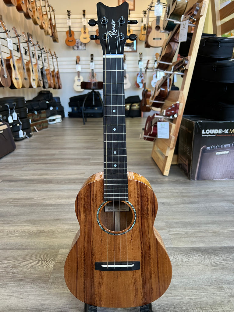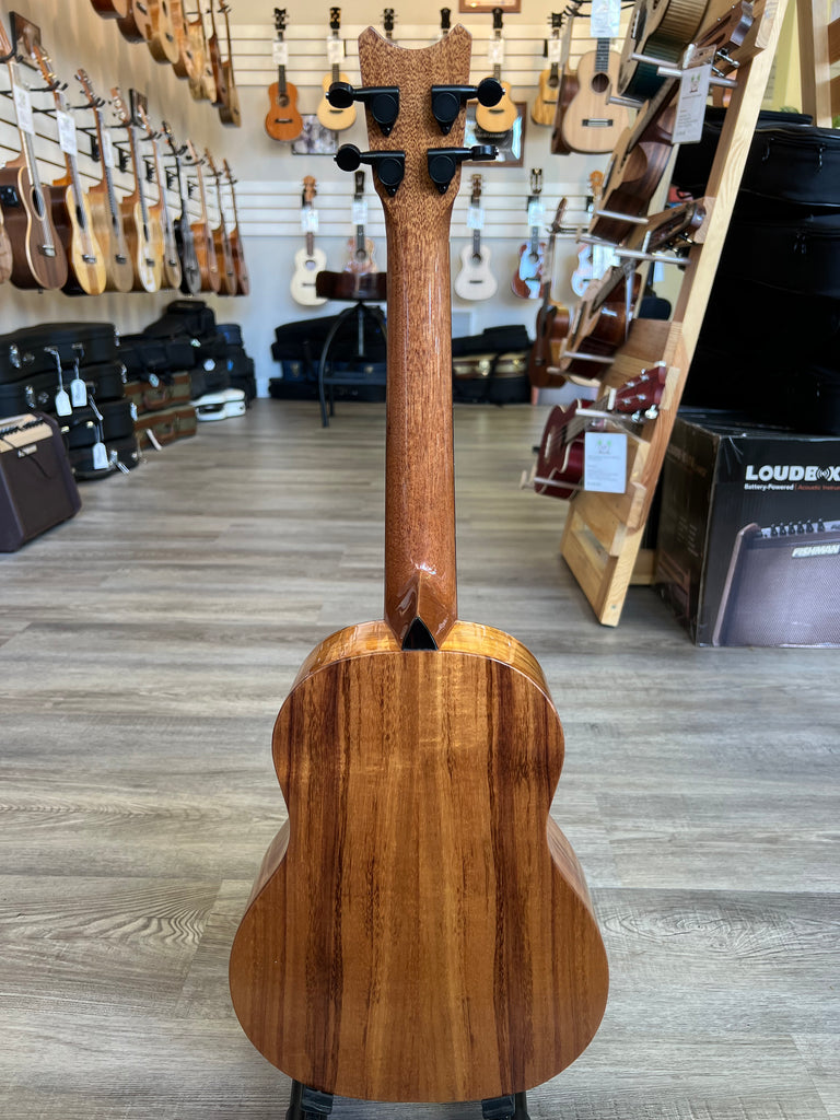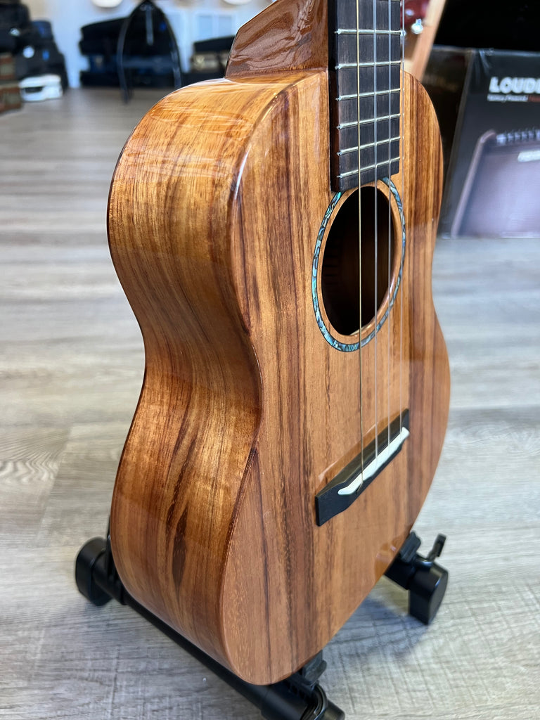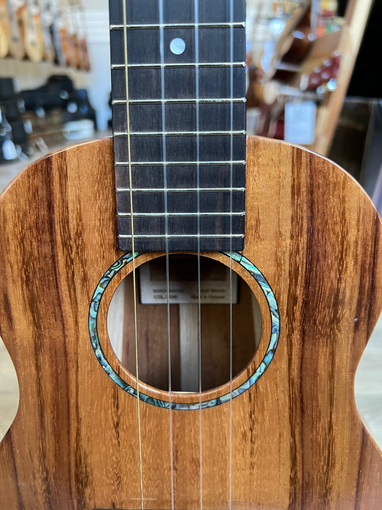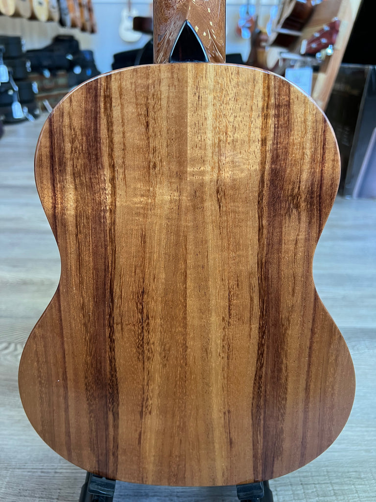 This all solid koa uke has a nice light shade with hints of red popping in the light. The abalone rosette and black tuners add a nice touch of class to a great sounding instrument. You won't be disappointed by this beauty. Comes with a Romero Creations case. Aloha !!