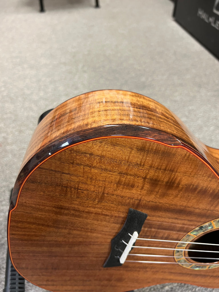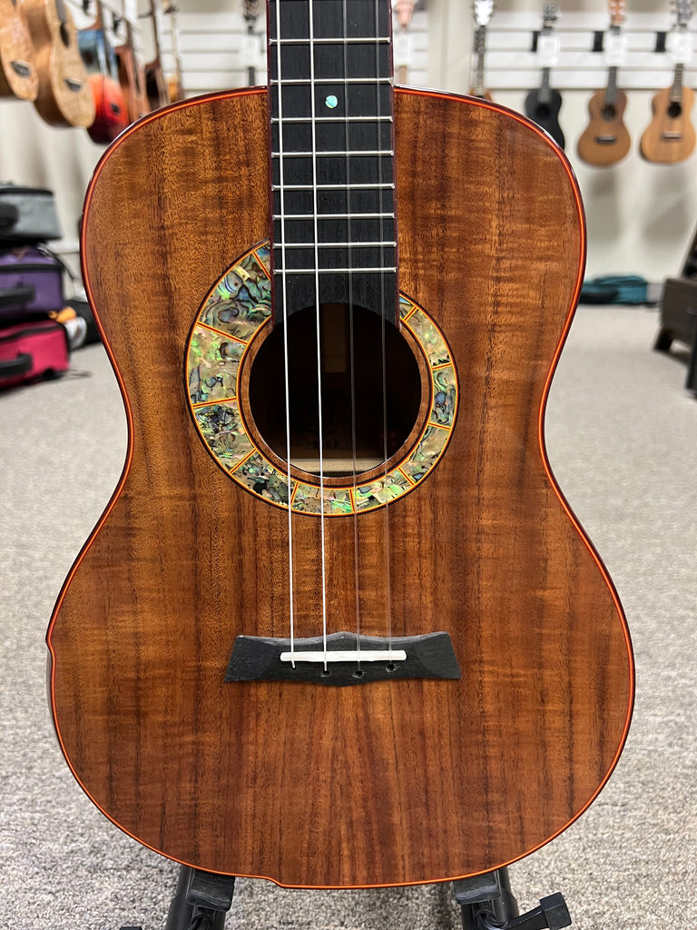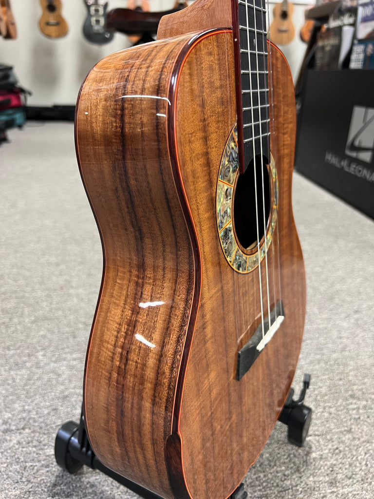 This Snail S60B Master made baritone ukulele is truly a work of art. It starts with an all solid flamed acacia body with a comfort contour armrest. An amazing looking abalone soundhole rosette and abalone dot inlays add a great touch of class. Plays and sounds as good as it looks. Aloha to that!